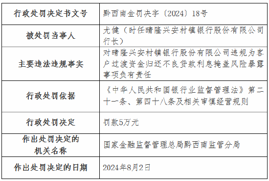 正文 晴隆兴安村镇银行被罚30万元:违规为客户过渡资金归还不良贷款利息掩盖风险暴露 信钰证券 V管理员 /2024-08-13 18:33:02/73阅读/0评论 0813 此篇文章发布距今已超过441天,您需要注意文章的内容或图片是否可用! 8月13日金融一线消息,国家金融监督管理总局黔西南监管分局行政处罚信息公开表显示,晴隆兴安村镇银行股份有限公司因违规为客户过渡资金归还不良贷款利息掩盖风险暴露,被罚款30万元。 尤健(时任晴隆兴安村镇银行股份有限公司行长)对晴隆兴安村镇银行股份有限公司违规为客户过渡资金归还不良贷款利息掩盖风险暴露事项负有责任,被罚款5万元。