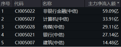 今日,主力资金大举流入180价值指数权重板块。Wind数据显示,截至收盘,非银行金融、银行、建筑获主力资金净流入额分别达到59.09亿元、27.14亿元以及14.48亿元,在30个中信一级行业中分别位居第1、第4和第5。