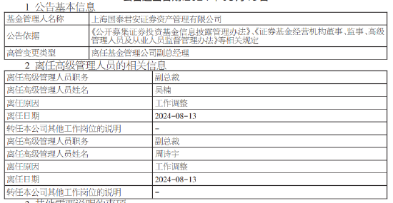 正文 国泰君安证券资产管理高管变更:副总裁吴楠、周诗宇因工作调整离任 信钰证券 V管理员 /2024-08-15 11:15:02/62阅读/0评论 0815 此篇文章发布距今已超过441天,您需要注意文章的内容或图片是否可用! 8月15日,上海证券资产管理有限公司发布基金行业高级管理人员变更公告,因工作调整副总裁吴楠、周诗宇离任,离任日期2024年8月13日。 上海国泰君安证券资产管理有限公司成立于2010年10月18日,是业内首批券商系资产管理公司。公司注册资本金 20亿元,是国泰君安证券的全资子公司。截止2024年二季度末,国公司资产规模563.9亿元。 公司主要成员: