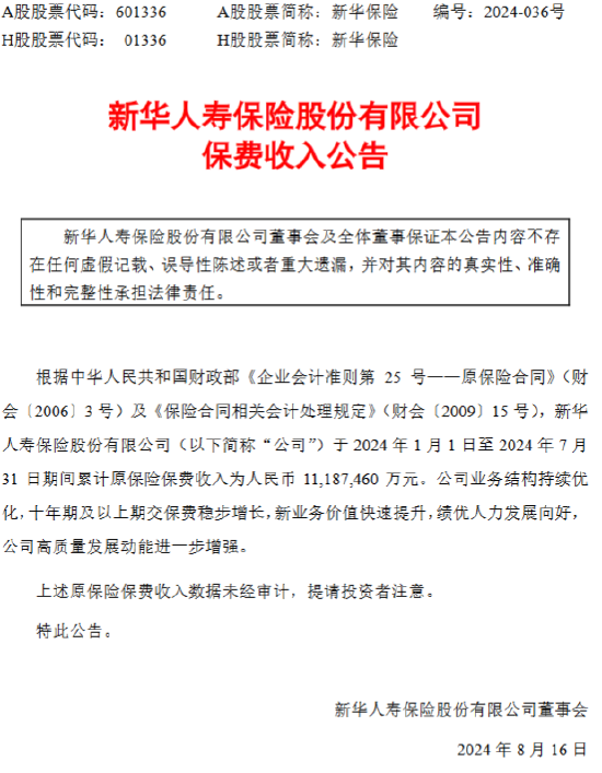 正文 新华保险:前7月累计原保险保费收入1118.75亿元 信钰证券 V管理员 /2024-08-16 17:14:04/68阅读/0评论 0816 此篇文章发布距今已超过440天,您需要注意文章的内容或图片是否可用! 8月16日金融一线消息,今日发布保费收入公告。公告显示,公司于2024年1月1日至2024年7月31日期间累计原保险保费收入约为1118.75亿元。