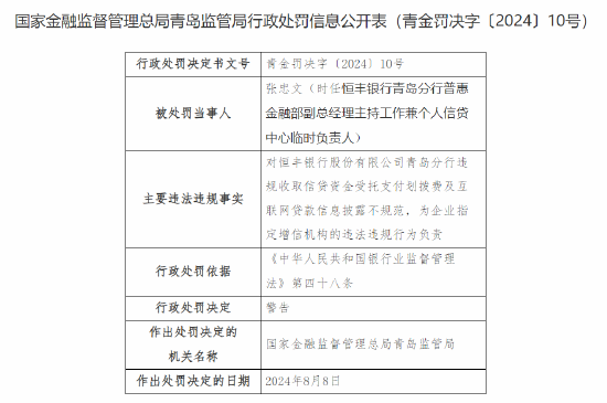 正文 恒丰银行青岛分行被罚52万:因违规收取信贷资金受托支付划拨费等 信钰证券 V管理员 /2024-08-16 17:22:02/66阅读/0评论 0816 此篇文章发布距今已超过440天,您需要注意文章的内容或图片是否可用! 8月16日金融一线消息,国家金融监督管理总局青岛监管局行政处罚信息公开表显示,恒丰银行股份有限公司青岛分行因违规收取信贷资金受托支付划拨费;互联网贷款信息披露不规范,为企业指定增信机构,被国家金融监督管理总局青岛监管局罚款人民币五十二万元;张忠文(时任恒丰银行青岛分行普惠金融部副总经理主持工作兼个人信贷中心临时负责人),对恒丰银行股份有限公司青岛分行违规收取信贷资金受托支付划拨费及互联网贷款信息披露不规范,为企业指定增信机构的违法违规行为负责,被监管警告。