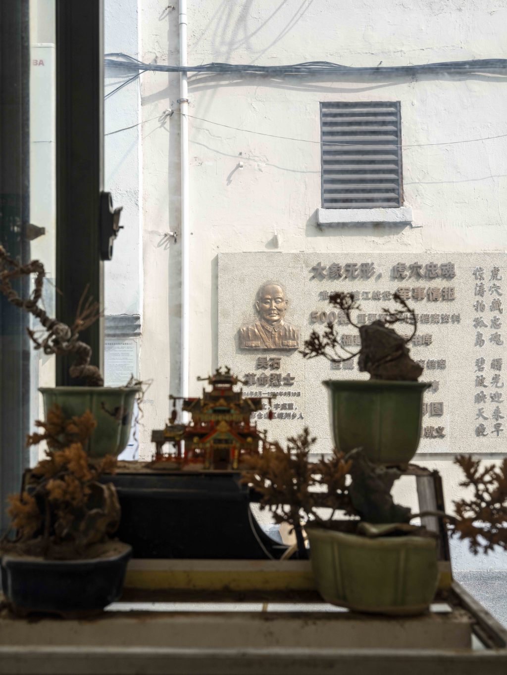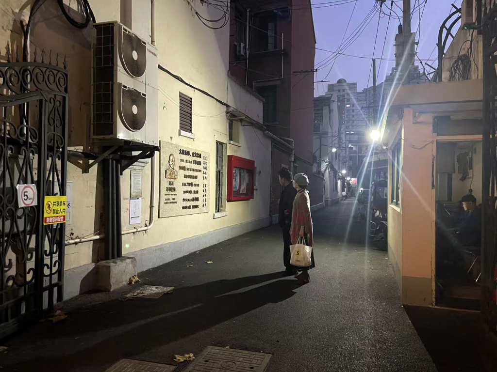 2025年10月26日,上海愚园路,从弄堂口的门卫室望出去的吴石纪念铭牌。