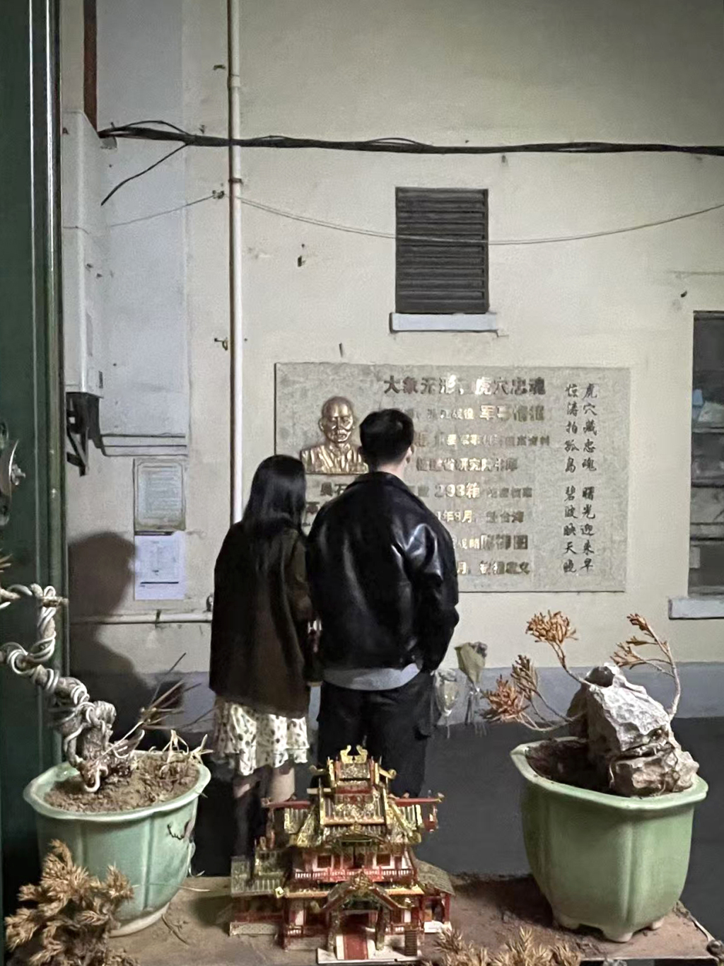 2025年10月26日,上海愚园路,两名年轻人在吴石纪念铭牌前。
