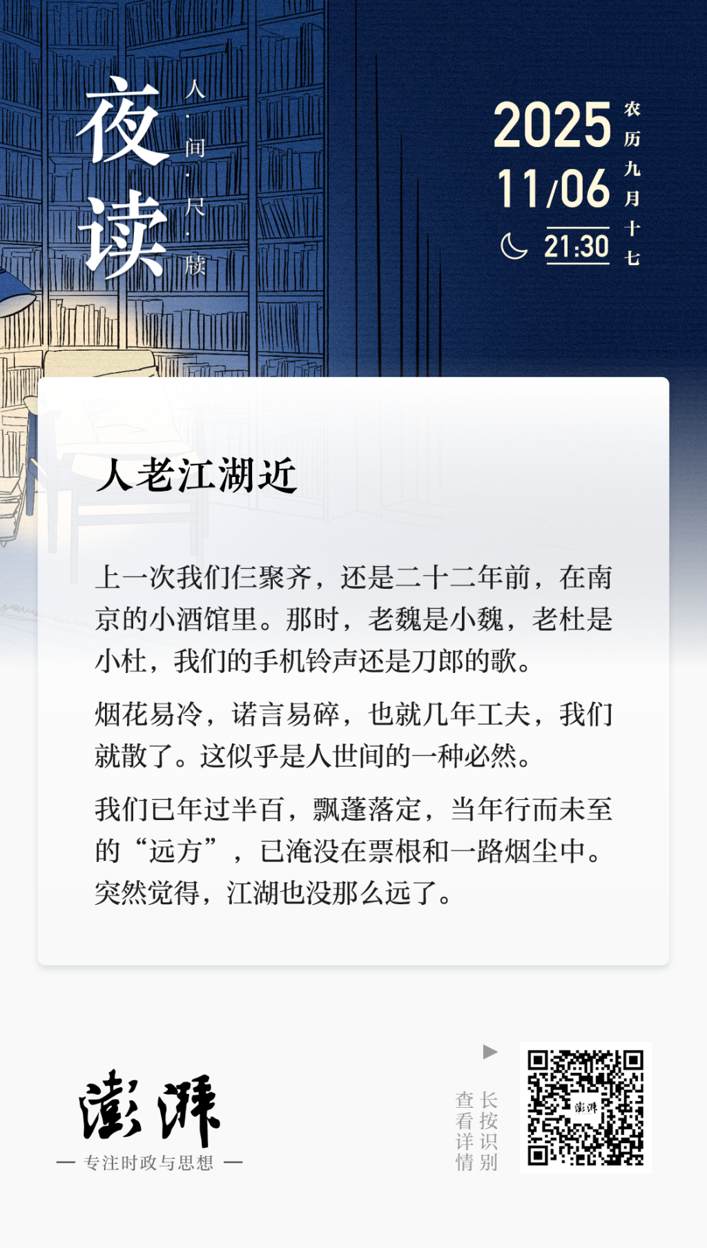 夏天结束前,我在南京办了一场聚会。来自中原的老魏,来自浙江的老杜,和我数日把酒言欢,难舍难分。上一次我们仨聚齐,还是二十二年前,在南京的一个小酒馆里。那时,老魏是小魏,老杜是小杜,我们的手机铃声还是“前度刀郎”的歌。