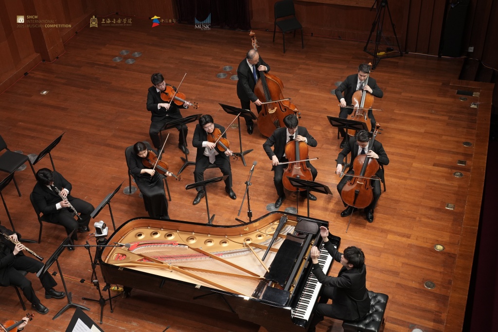 决赛之夜,4位选手边弹琴边指挥,完成了与上海音乐学院室内乐团的对话。这是一支25人的乐团,由上音师生组成,多位名师担任声部首席。