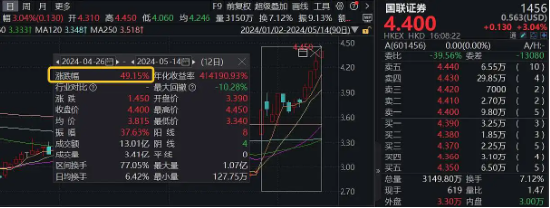 A股停牌的国联证券,H股大幅拉升,区间涨幅更是高达49.15%。